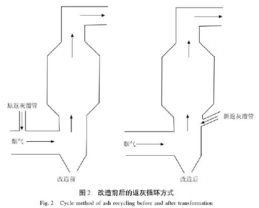 原返灰进入脱硫塔的方式:中间灰仓—星型给料机—溜管—脱硫塔入口烟道上部。由于烟气须经文丘里加速,保证循环流化床的形成,文丘里下部及入口烟道处压力偏低,返灰循环量增大时造成返灰塌落至脱硫塔底部锥斗。为提高返灰循环倍数,提高脱硫效果,返灰溜管由入口烟道改至文丘里中部(图2),既保证了返灰循环量,又保证了返灰在文丘里出口脱硫段的均匀分布。