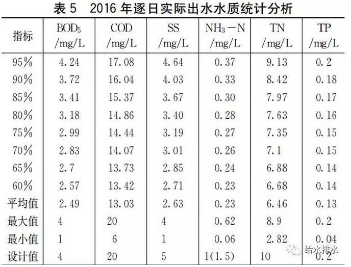 工程2016年逐月实际出水水质见表4;对2016年逐日实际出水水质进行数理统计分析,结果见表5。